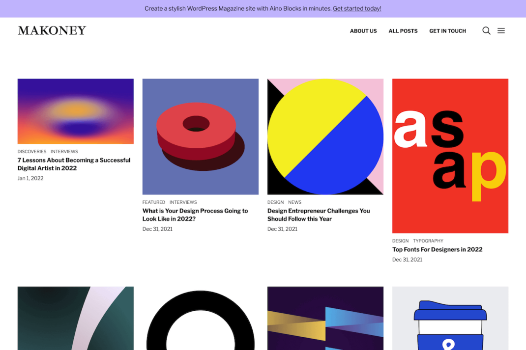 Wir haben auf AinoBlocks.io schon erste Premium Block-Themes veröffentlicht. Weitere kostenlose Block-Themes findest du im WordPress.org Theme-Verzeichnis unter dem Filter “Full Site Editing”. Dort findest du auch unser kostenloses Aino Starter-Theme.